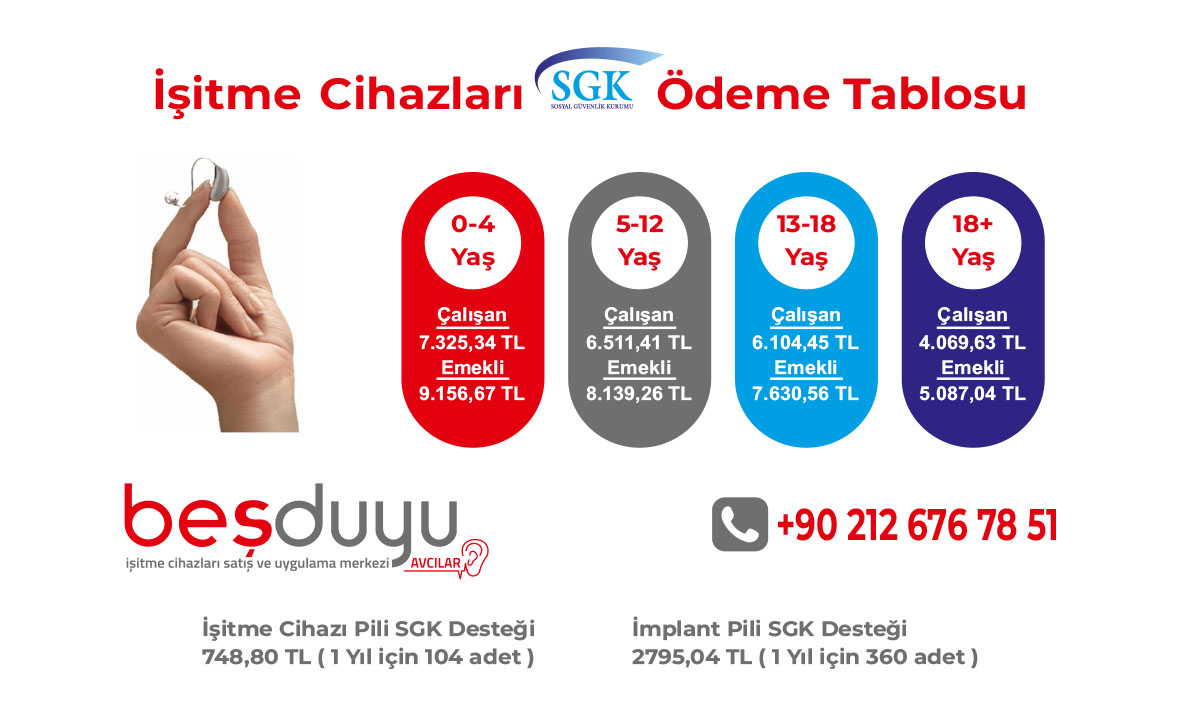 - Çalışanlar için: İşitme cihazı SGK ödemesinde %20 katılım payı, işitme merkezine elden ödenmektedir.